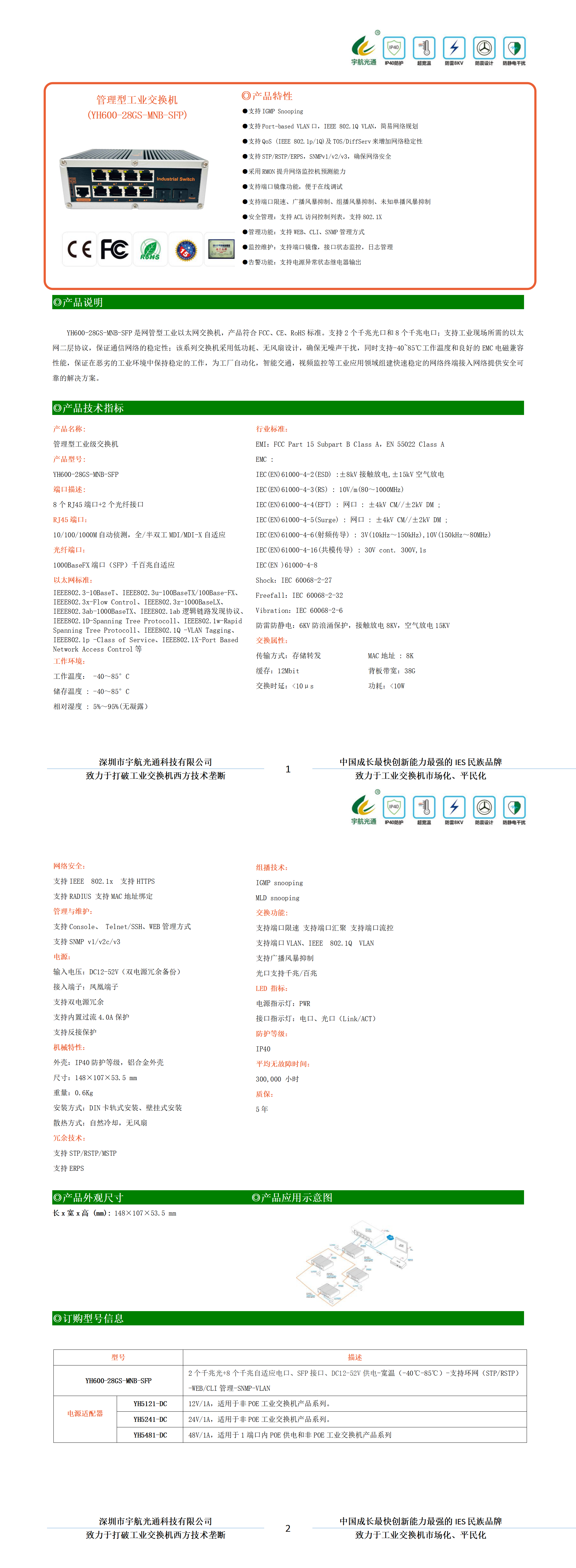 YH600-28GS-MNB-SFP是網管型工業(yè)以太網交換機,產品符合FCC、CE、RoHS標準。支持2個千兆光口和8個千兆電口;支持工業(yè)現(xiàn)場所需的以太網二層協(xié)議,保證通信網絡的穩(wěn)定性;該系列交換機采用低功耗、無風扇設計,確保無噪聲干擾,同時支持-40~85℃工作溫度和良好的EMC電磁兼容性能,保證在惡劣的工業(yè)環(huán)境中保持穩(wěn)定的工作,為工廠自動化,智能交通,視頻監(jiān)控等工業(yè)應用領域組建快速穩(wěn)定的網絡終端接入網絡提供安全可靠的解決方案。